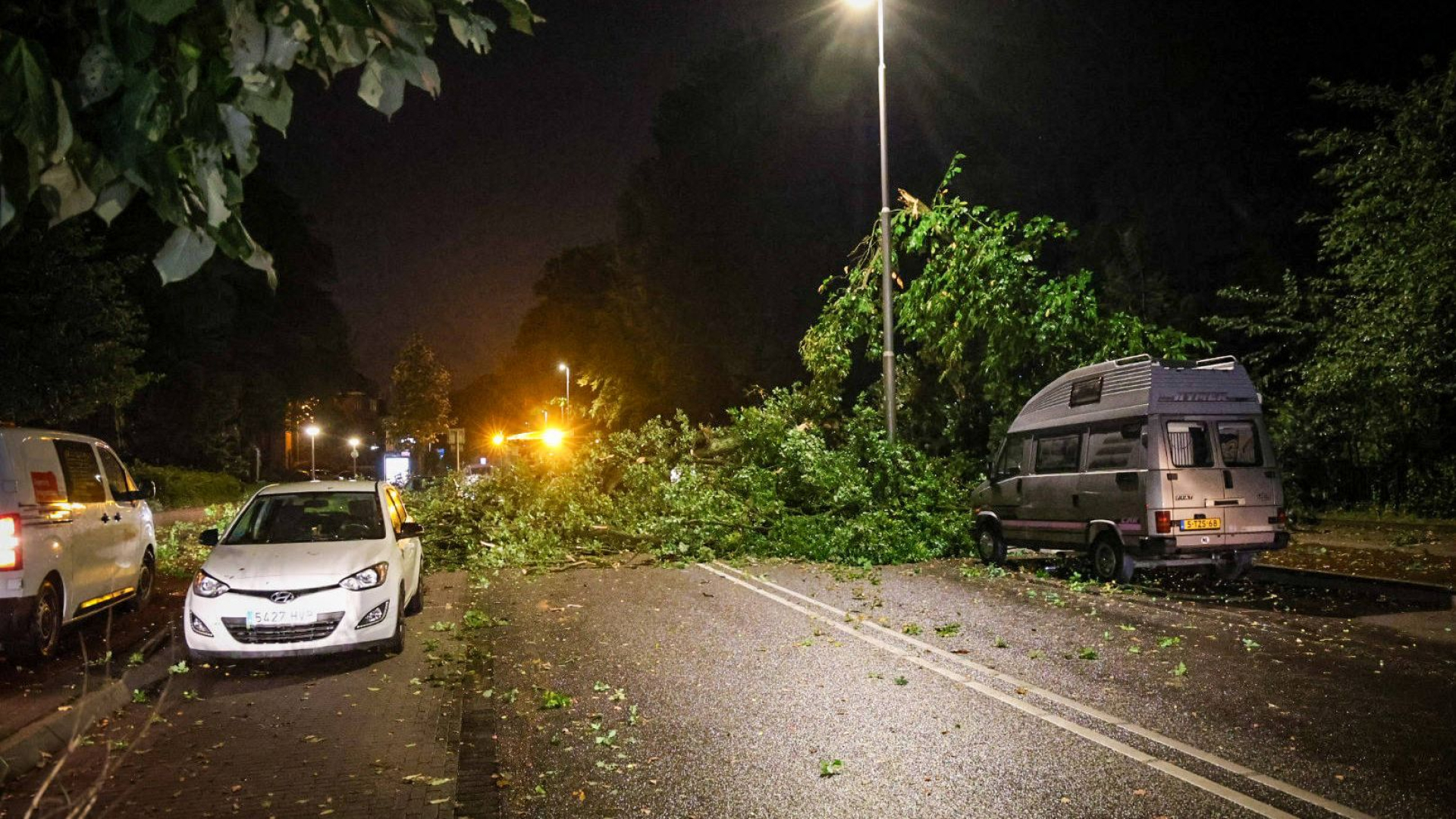 De Apeldoornseweg in Arnhem is maandagochtend vroeg volledig afgesloten door twee omgevallen bomen. Geparkeerde auto's en een camper hadden geluk en werden net niet geraakt.