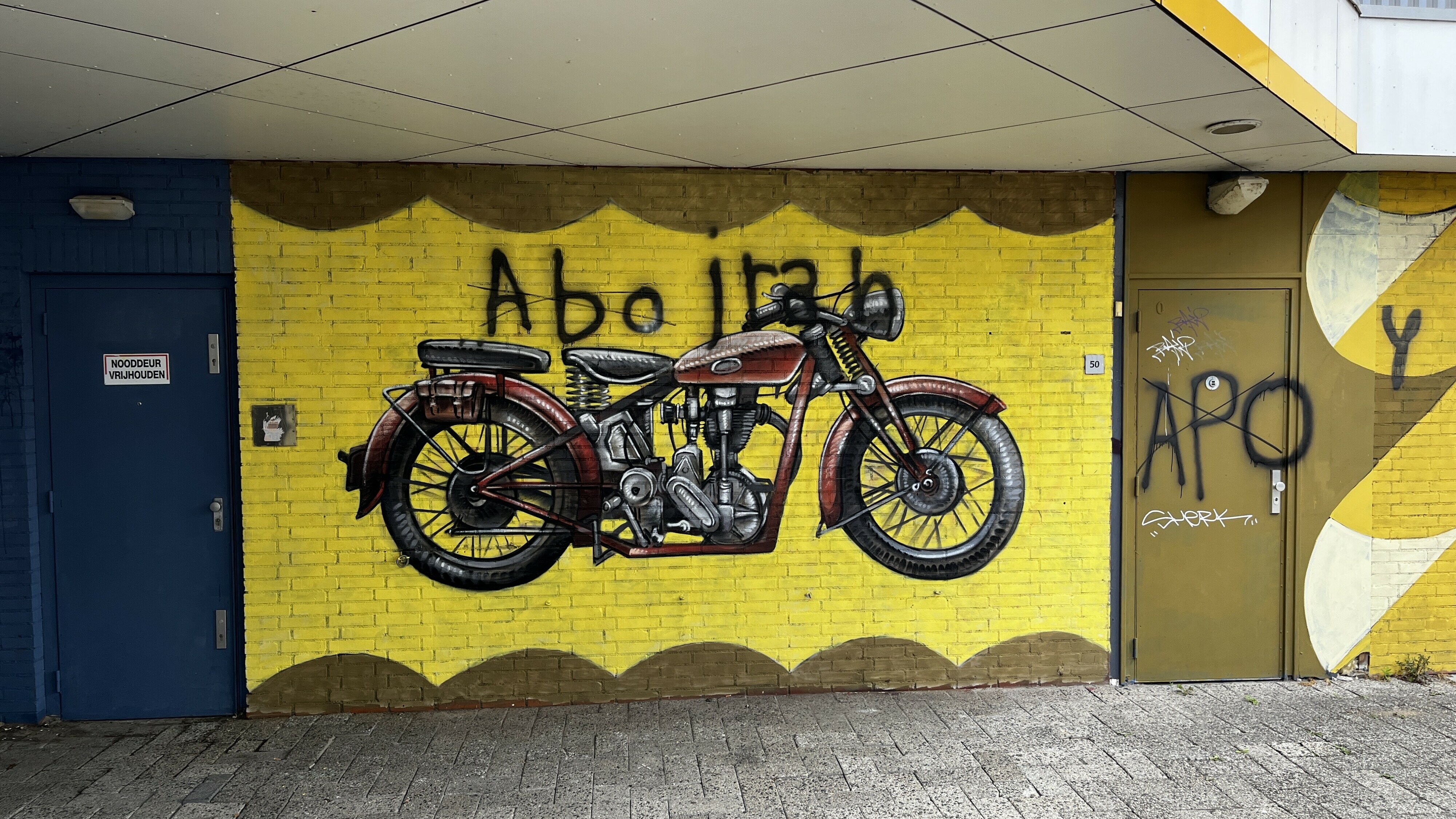 Bij het Mercuriuscentrum in Assen zijn verschillende TT-muurschilderingen gemaakt, maar een daarvan is bewerkt door graffitispuiters.