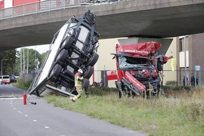 Vrachtwagen rijdt van viaduct en valt meters naar beneden, weg uren dicht