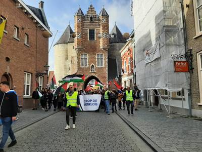 zaterdag 28 oktober 2023, 14:52 uurBERGEN OP ZOOM - Een groep van zo'n 400 mensen trok zaterdagmiddag door de binnenstad van Bergen op Zoom voor een vredesmars om solidariteit met het Palestijnse volk te tonen. Deelnemers droegen Palestijnse vlaggen en voorop liepen mensen achter een groot spandoek met de tekst ‘stop de oorlog’.
