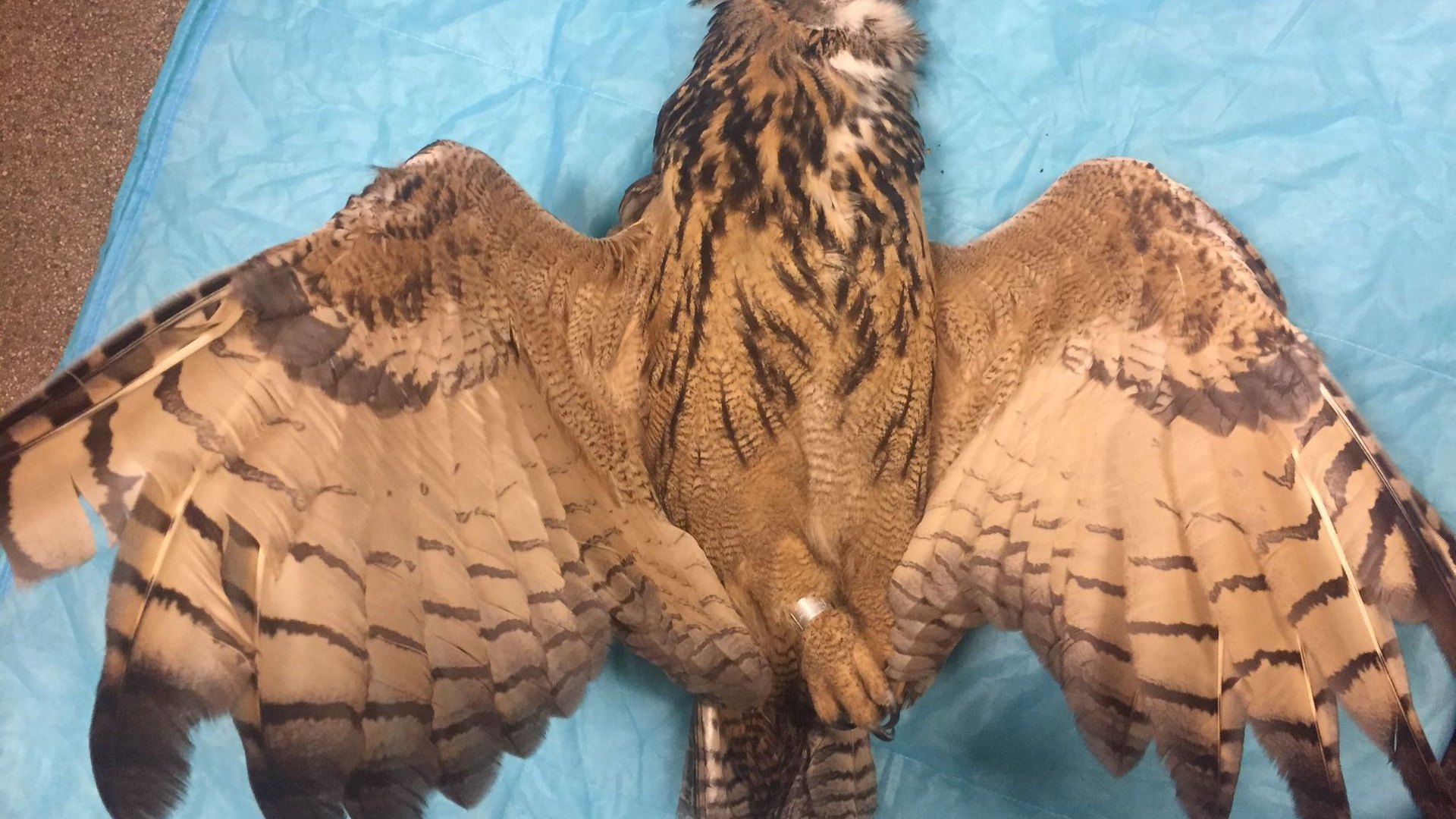 Een verkeerscontrole bij Beugen heeft vrijdagavond een onfortuinlijk slachtoffer geëist. Geen snelheidsduivel die op de bon werd geslingerd, maar een enorme oehoe. Het arme dier vloog in volle vaart tegen een politiebusje en overleefde de klap niet.
