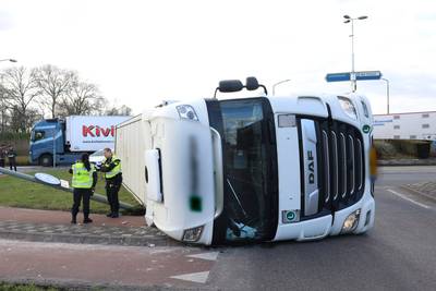 Vrachtwagen kantelt op rotonde, chauffeur raakt gewond
