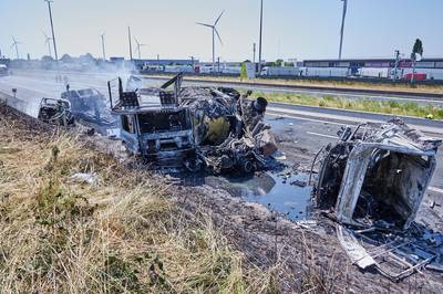 Niets meer over van vrachtwagens na botsing en enorme brand op A16