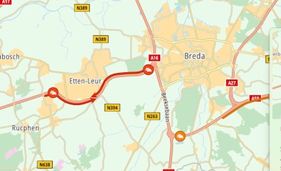 Kaart nieuws Breda. Locatie nieuws: ANWB om een stuk snelweg
