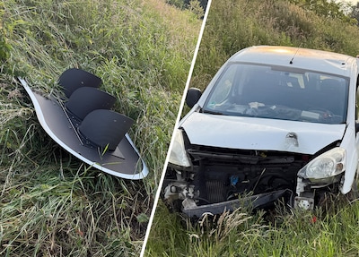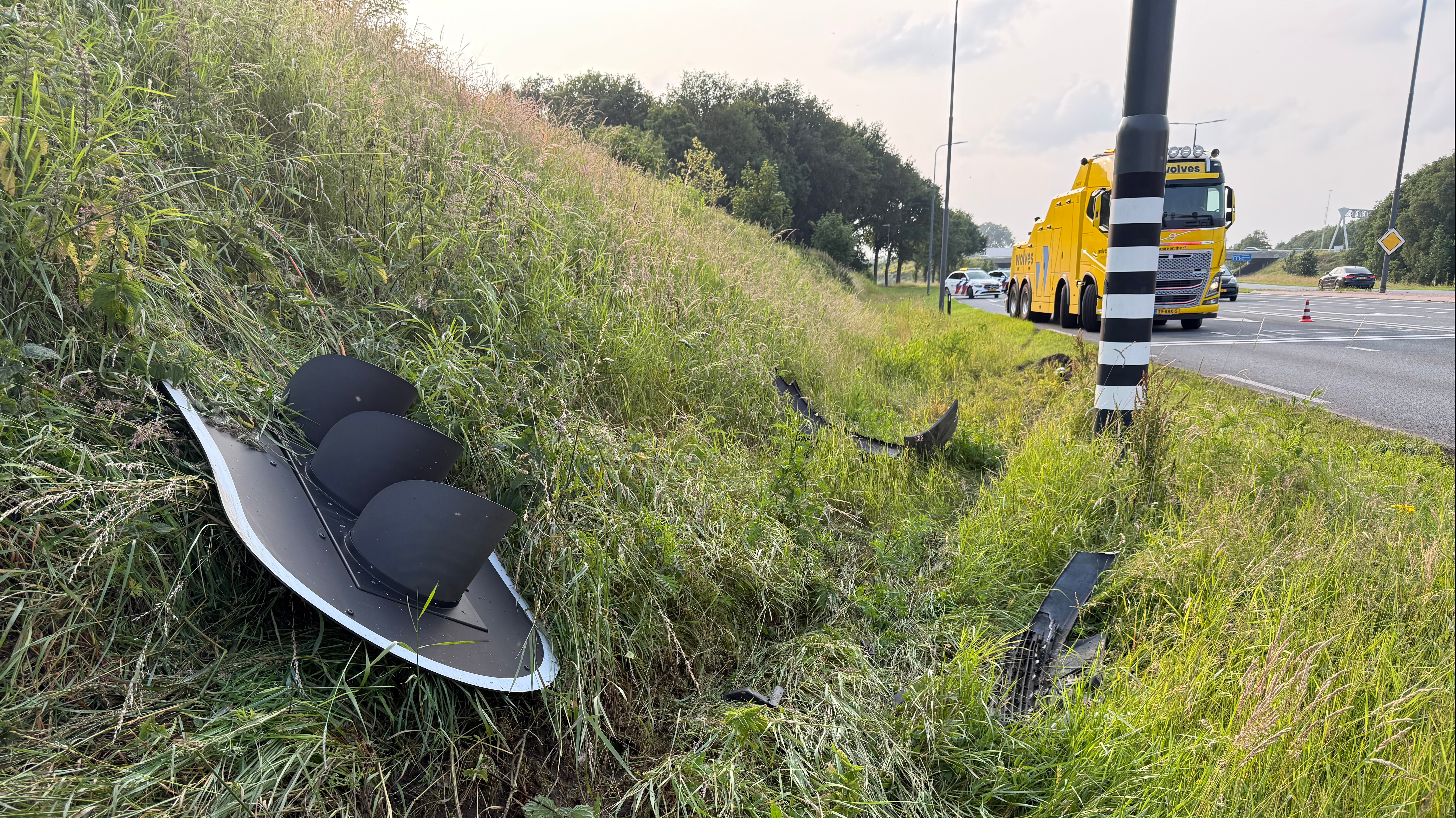 Een flinke ravage op de Deventerweg (N348) bij Deventer. Daar ramde een bestelbus een verkeerslicht en kwam in de berm tot stilstand, naast de schuine wand van een geluidswal.