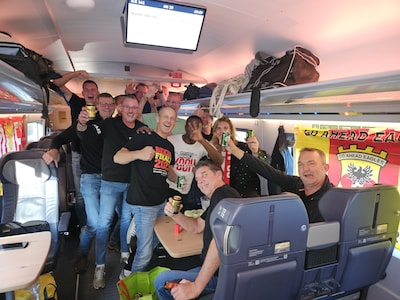 Sfeer zit er goed in: supporters GA Eagles onderweg naar Salzburg
