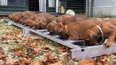 Vijftien voederbakken op een rij - Eddy moest ze zelf maken. „Want die verkopen ze niet in de winkel.” Logisch ook: welke hond krijgt nu vijftien puppy’s tegelijk? Hun Rhodesian ridgeback wel. En alle kleintjes hebben het overleefd.