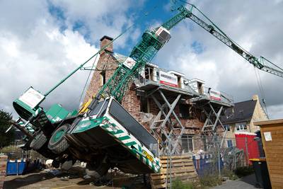 Twee nieuwbouwhuizen in de Doetinchemse wijk Wijnbergen zijn woensdagmorgen beschadigd geraakt, nadat een bouwkraan is omgevallen en op het dak van beide woningen belandde.