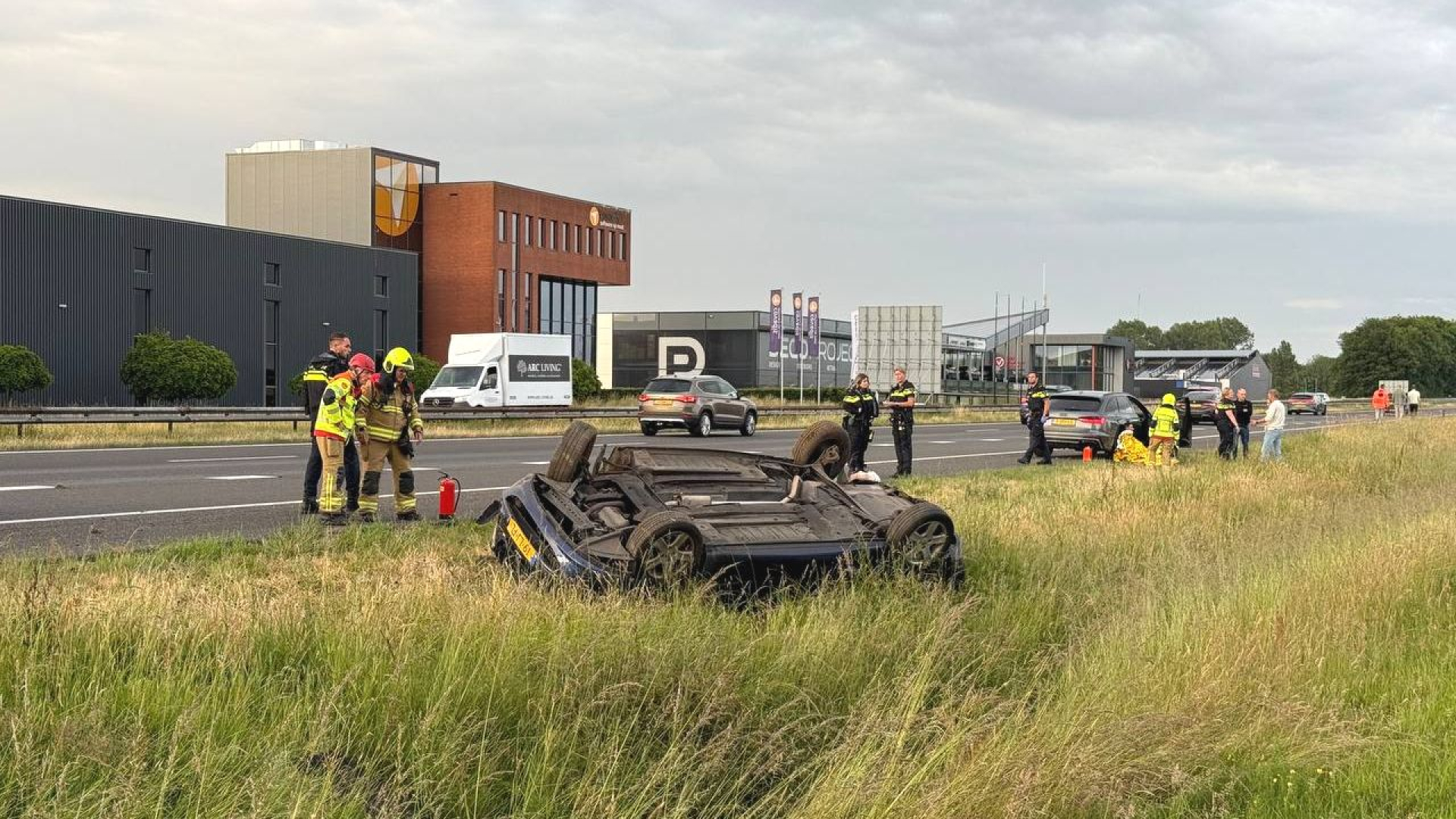 Auto belandt op de kop in berm langs A18