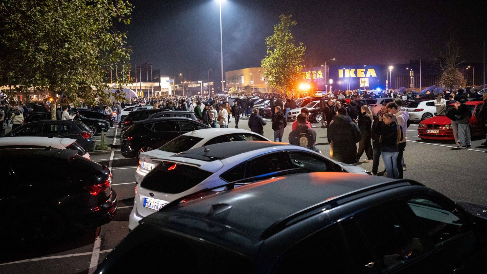 Op het parkeerterrein van de Makro in Duiven verzamelden zich donderdagavond honderden mensen met hun auto's. Ook waren er veel agenten op de been.