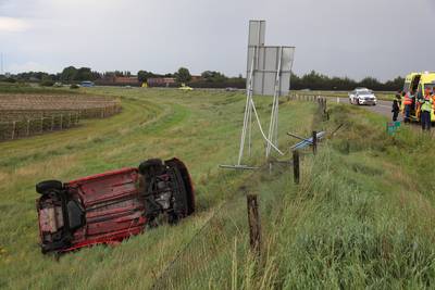 Auto botst tegen verkeersbord en belandt op zijn zij op de A30 bij Ede