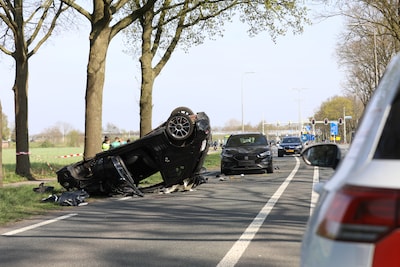 Auto belandt op dak na botsing, bestuurder met spoed naar ziekenhuis