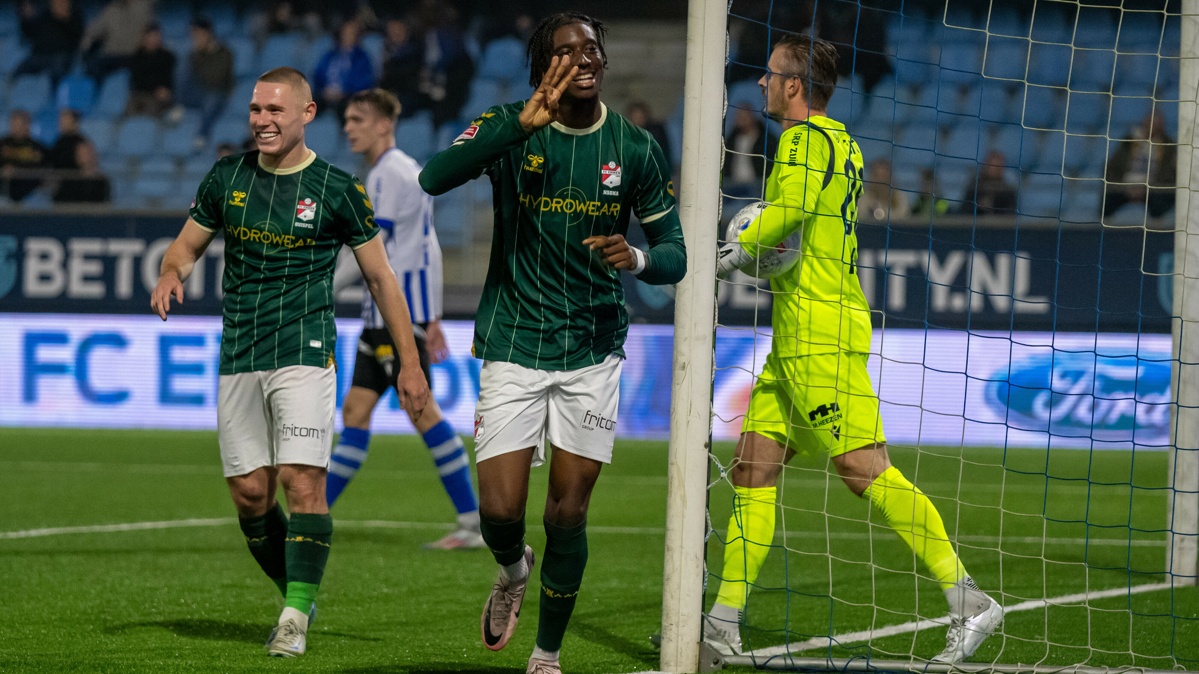 Kélian Nsona wijst FC Emmen met drie goals de weg bij FC Eindhoven