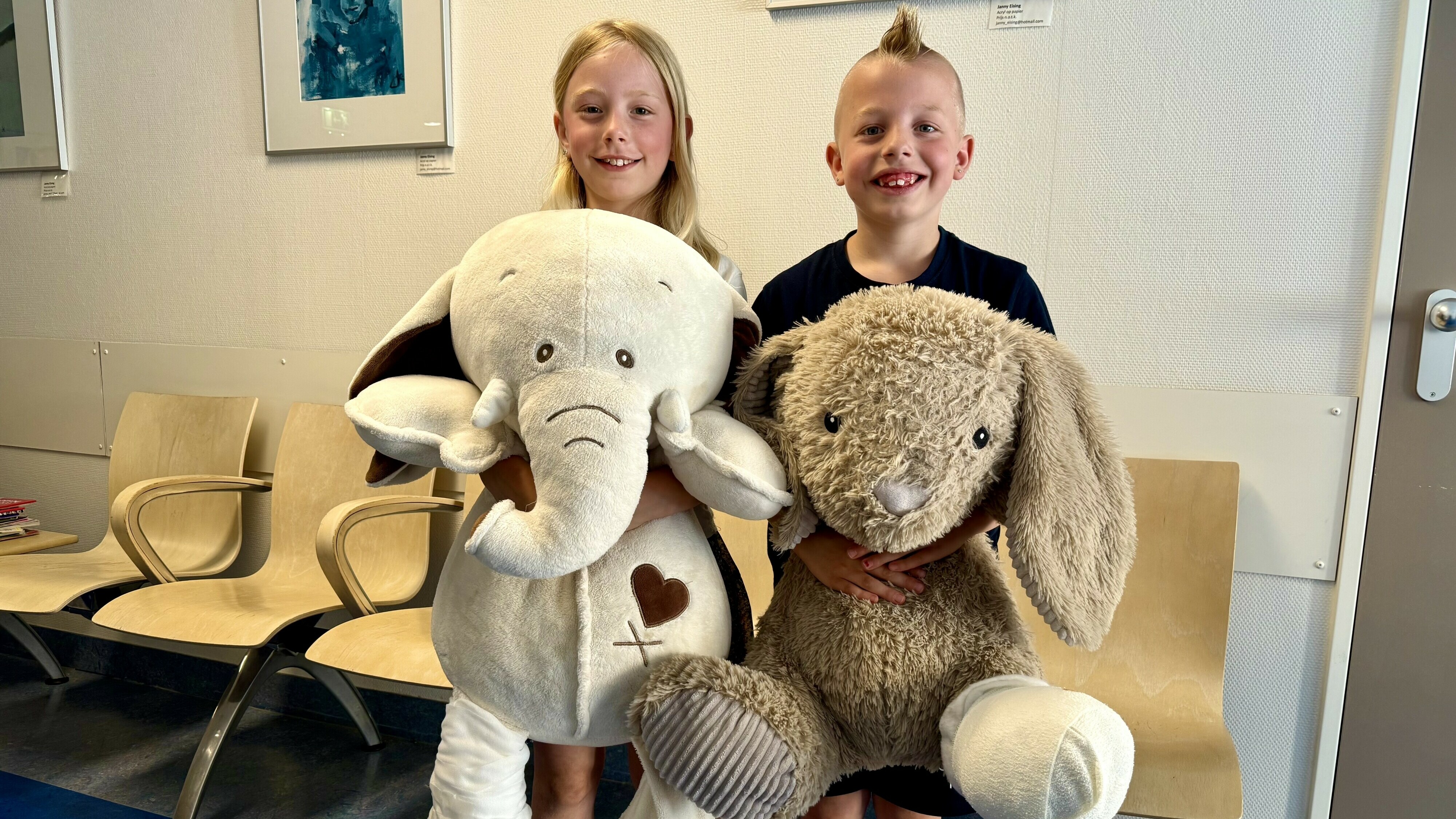 zaterdag 17 mei 2025, 17:12 uurIsa en Tijn zitten met hun grote knuffelberen in de wachtkamer van het Scheper ziekenhuis. Zelf hebben ze nergens last van, maar hun knuffels daarentegen wel.