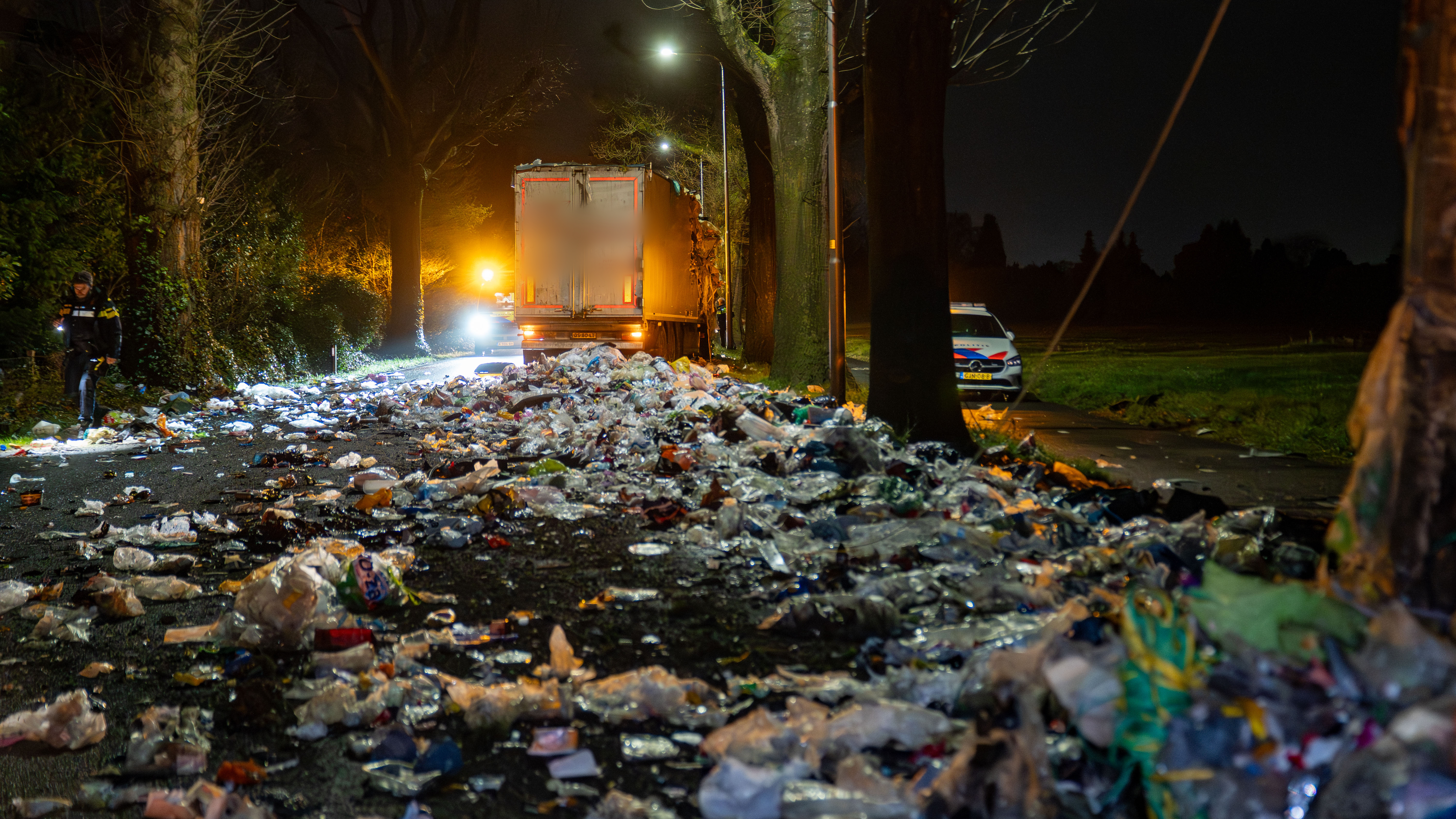 Vrachtwagen botst tegen boom, hele weg bezaaid met huisvuilnis