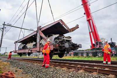 ETTEN-LEUR - Daags na de brand wordt een monsterklus uitgevoerd op het spoor tussen Roosendaal en Etten-Leur. Met uiterste precisie worden de vier wagons met daarop 48 uitgebrande hybride auto's van het spoor gehesen. Om vervolgens naar een veilige plek te worden vervoerd voor verder onderzoek.
