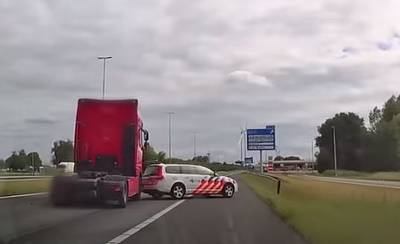 Bizarre beelden van achtervolging: truckchauffeur ramt politieauto van snelweg af