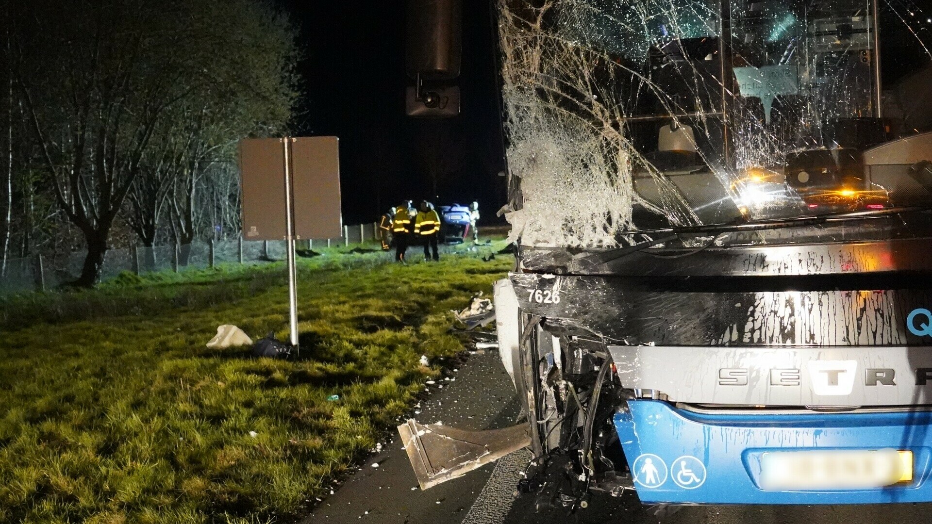 Op de N34 bij Gieten zijn in de nacht van dinsdag op woensdag een auto en een lijnbus frontaal tegen elkaar gebotst.