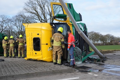 Vrachtwagen kantelt in Gilze, omstanders breken ruit open om gewonde chauffeur te bevrijden
