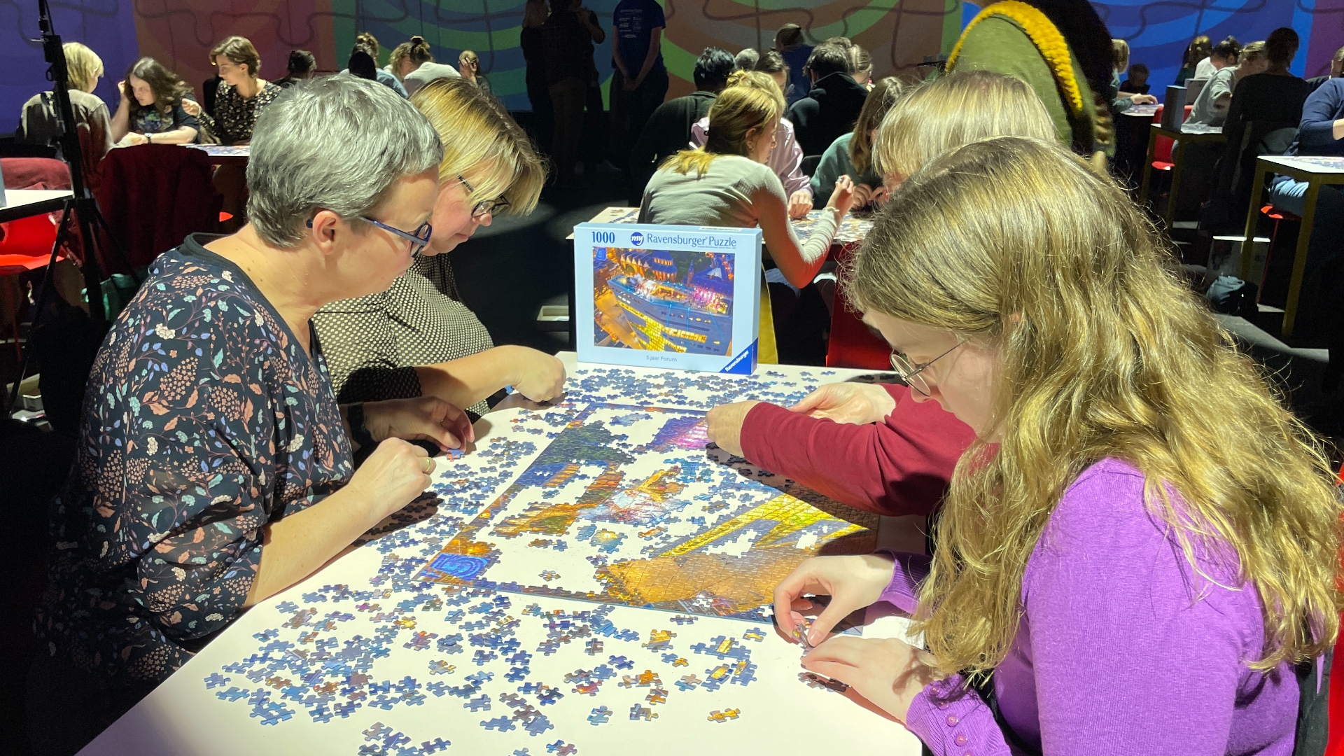 In een zaal vol geconcentreerde gezichten werken teams van vier personen hard aan puzzels van duizend stukjes. 'Oef, dit is wel moeilijk hoor. Er zijn zoveel donkere stukjes, maar het gaat best goed', zegt Marieke Hartsema uit Groningen. Samen met haar dochter en twee collega’s probeert ze in recordtempo de puzzel te voltooien.