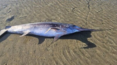 Zwaardvis die aanspoelde in Groningen waarschijnlijk gestikt in modder