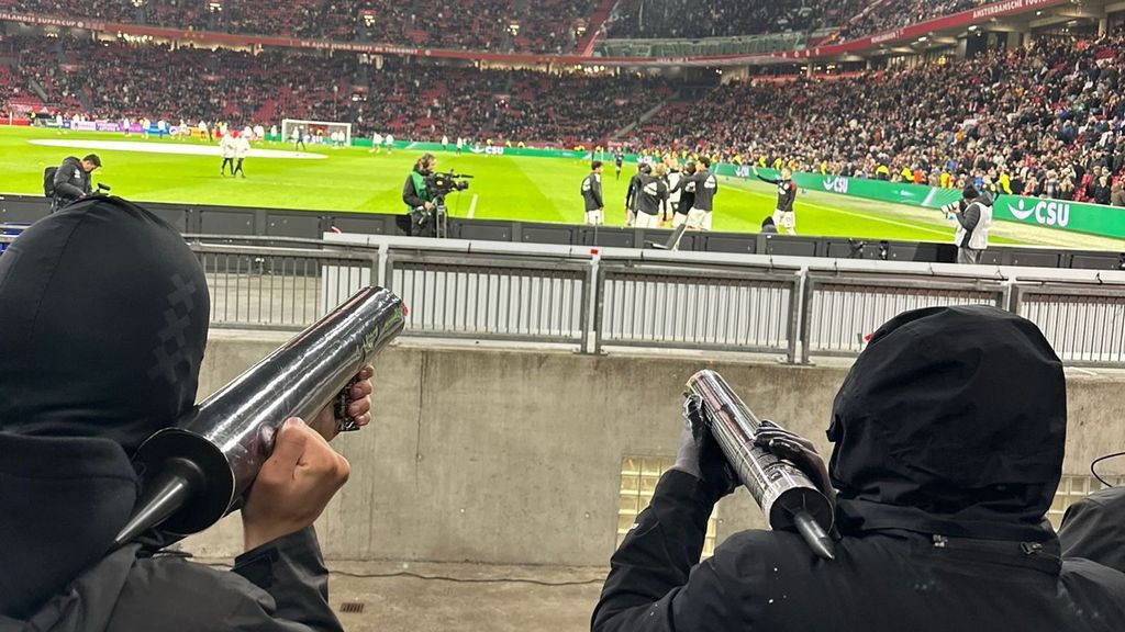 dinsdag 2 december 2025, 13:55 uurZondagavond werd het duel tussen Ajax en FC Groningen gestaakt nadat er meermaals zwaar en massaal vuurwerk was afgestoken. Op sociale media dook een bizar beeld op, waarbij twee hooligans te zien zijn met langwerpige voorwerpen, gericht op de warmlopende Ajax-spelers. Maar is de foto echt en wat valt er te zien?