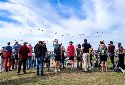 Wat was het weer spectaculair. De indrukwekkende massadropping, die onderdeel is van de herdenking van de luchtlandingen bij Operatie Market Garden, trok ruim 50.000 bezoekers. Militairen van de 11 Luchtmobiele Brigade en NAVO-landen sprongen massaal uit vliegtuigen.