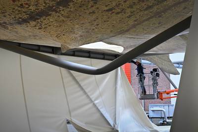 Een gespecialiseerd bedrijf heeft vandaag vrijwel al het zeil boven de Brinkpassage in Hengelo weggehaald. Vorige week donderdag dreigde het zogeheten luchtkussendak het te begeven doordat er veel regen op lag. De winkels in de passage kunnen morgen mogelijk weer open.