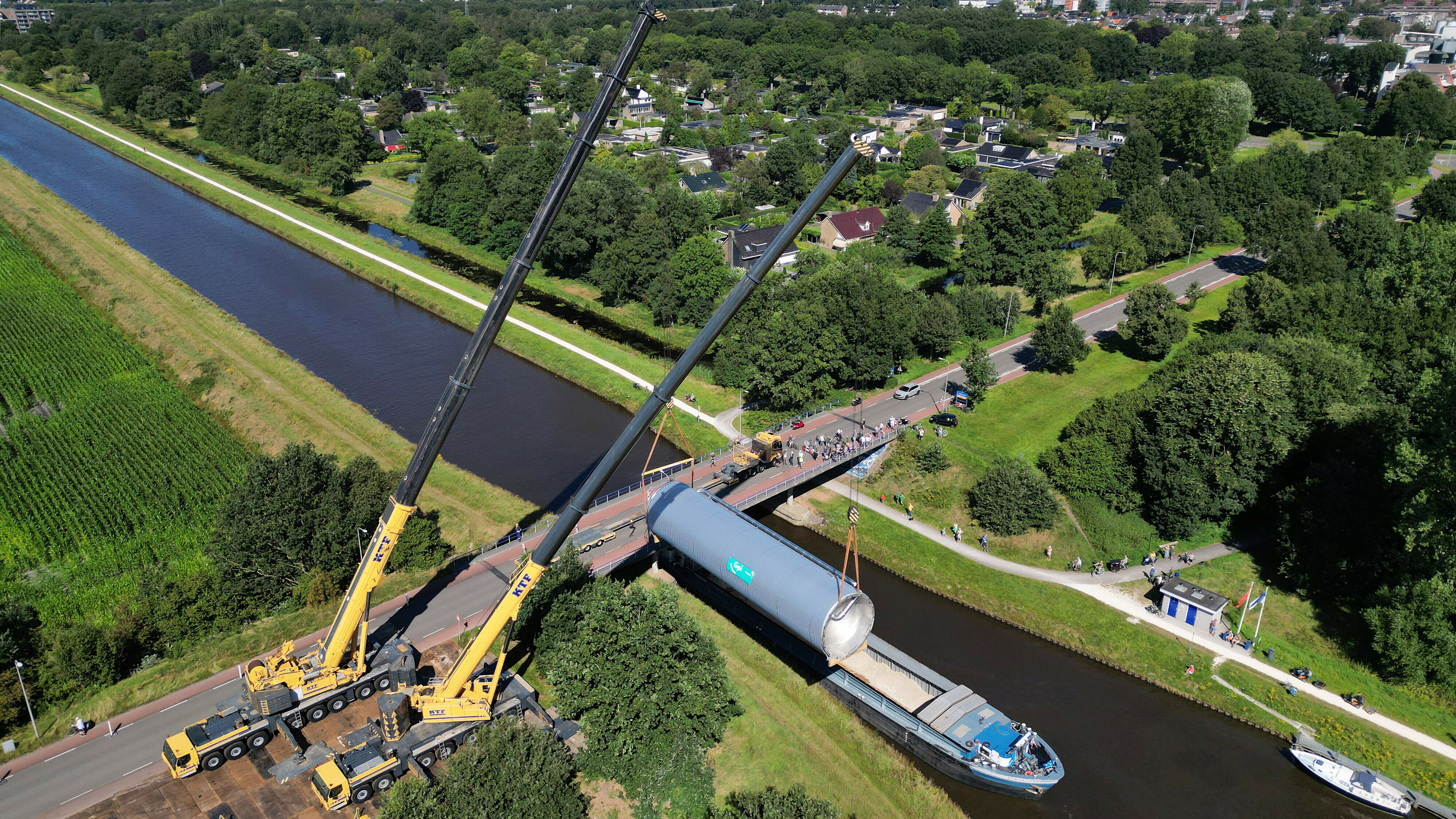 Groot transport voor een buffertank voor DOC Kaas vanaf het kanaal in Hoogeveen
