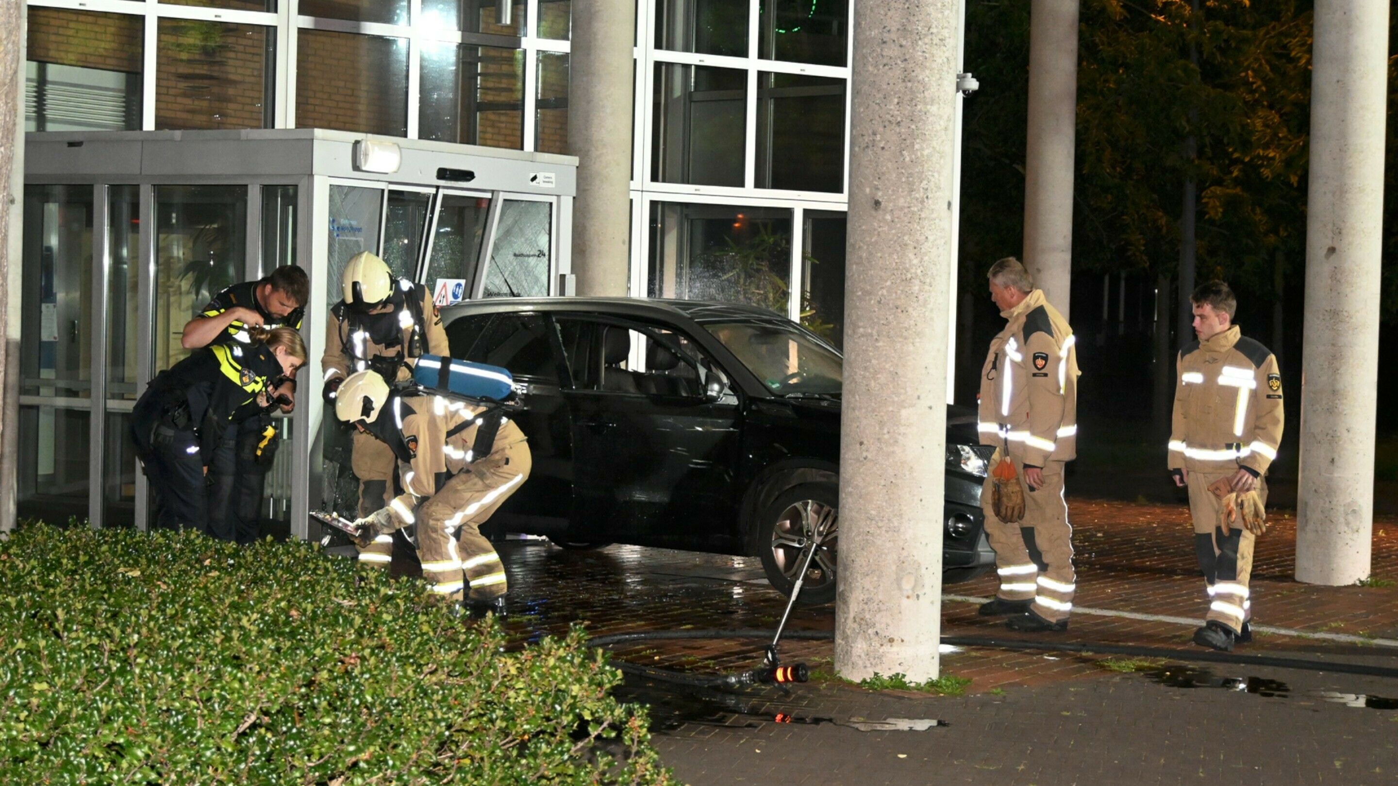 Man rijdt met auto in op gemeentehuis Hoogeveen, auto vat vlam