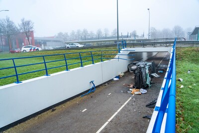 Een bizar ongeluk zaterdagochtend in Lelystad. Een auto die op de Larserdreef reed, raakte rond kwart voor negen van de weg waarna het voertuig op het wegdek smakte van het tunneltje eronder, de Torenvalktunnel. De bestuurster is zwaargewond geraakt.