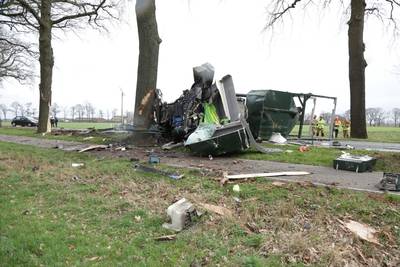 Chauffeur ramt vijf bomen en kantelt, ravage op de weg