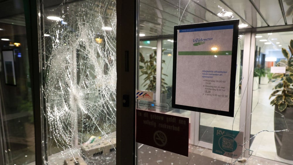 Gemeentehuis Loosdrecht vernield, stoeptegels en verkeersborden door ramen gegooid