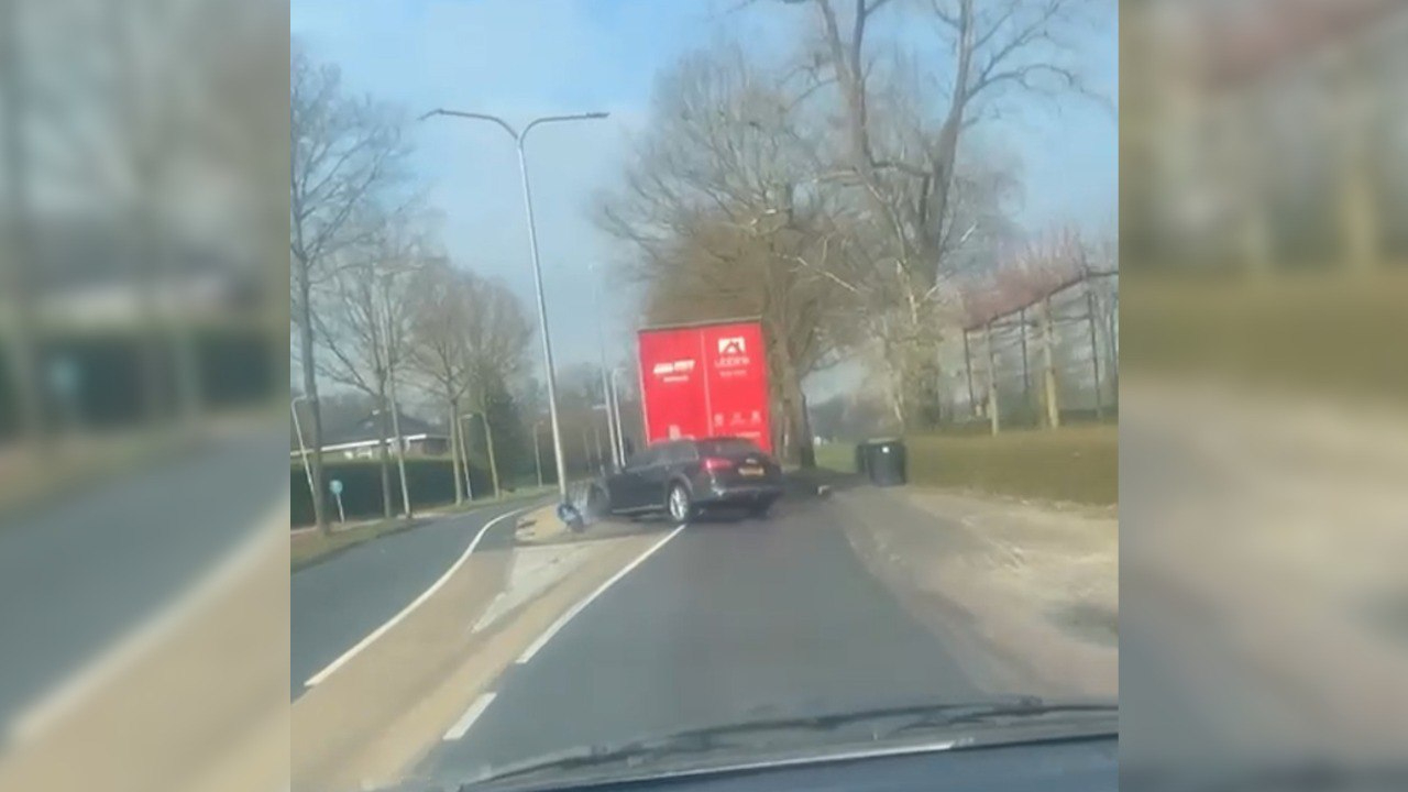 Bizarre verkeerssituatie: vrachtwagen sleept auto tientallen meters mee door Losser