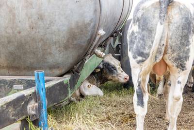 Brandweer rukt uit voor koe die bekneld raakt onder watertank