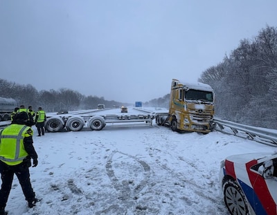 Een vrachtwagencombinatie is door de gladheid geschaard op de A59 bij Made. Door het ongeval is de snelweg tussen knooppunt Zonzeel en Made in de richting Den Bosch afgesloten.