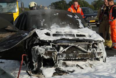 De voorkant van de auto is grotendeels uitgebrand en volgens omstanders is het wegdek ook door de brand beschadigd.
