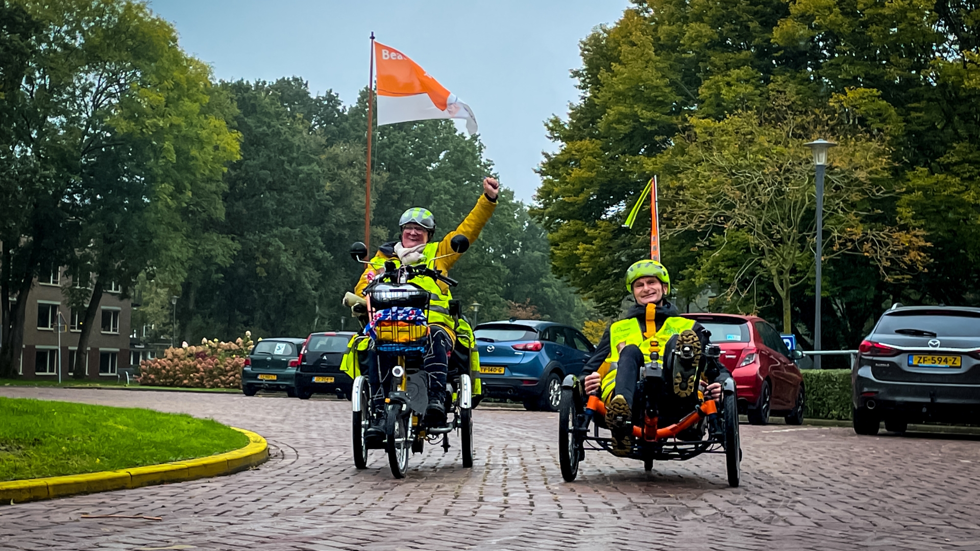Patiënten en medewerkers zwaaien met zwart-witte racevlaggetjes onder de overdekking van UMCG Centrum Beatrixoord voor Revalidatie in Haren. Eerst een groep fietsers van het Centrum, en daarachter de twee waar het maandagmiddag om draait. Marita Tessin (53) en René Marcel van Dijk (55), met badeendjes op hun fietsen en in opvallende kleding, worden verwelkomd door Queen's 'Bicycle' en een start-finishvlag die steeds weer recht gehangen moet worden.