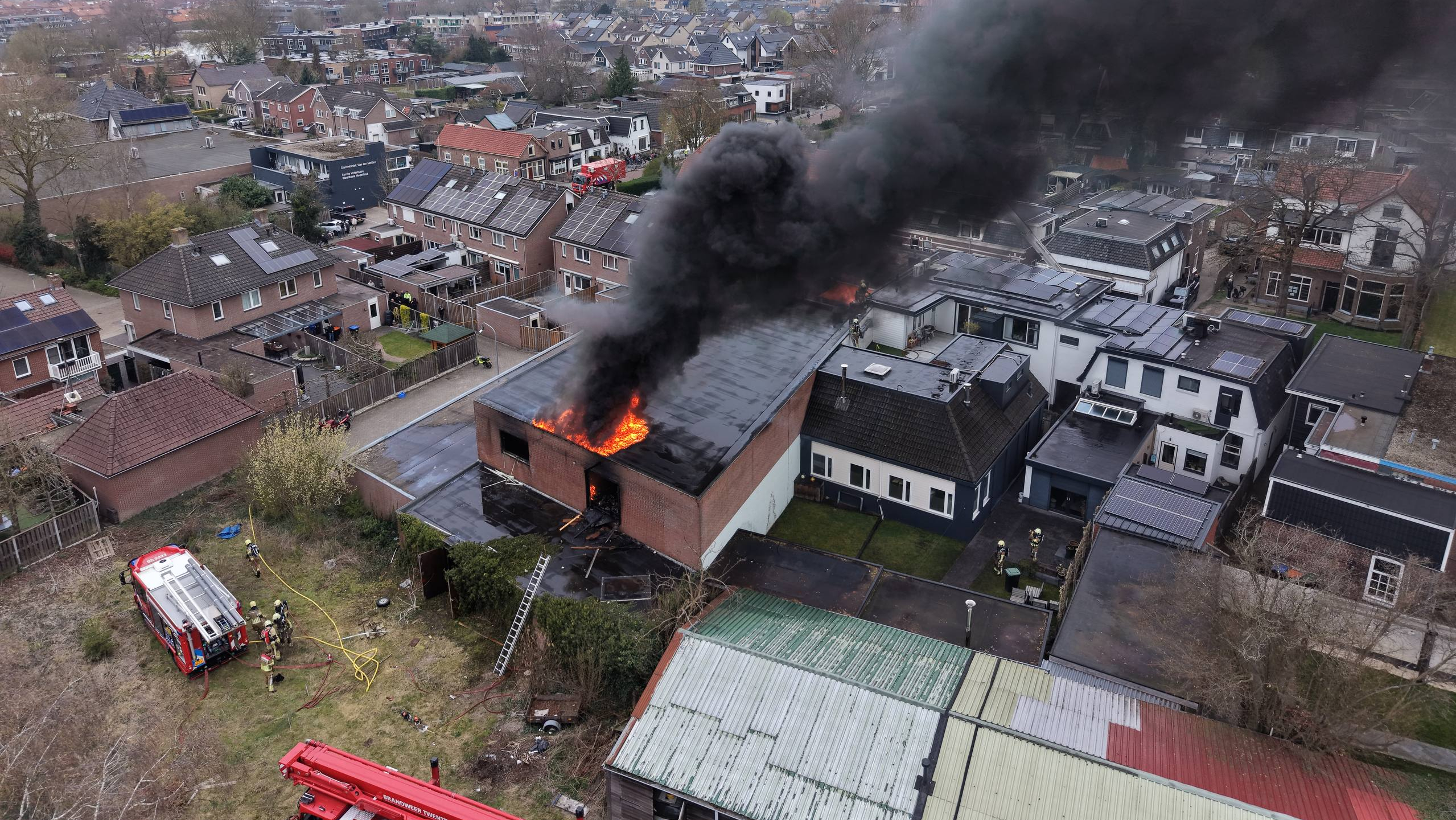 Grote uitslaande brand in loods achter woningen in Nijverdal; brandweer schaalt op naar GRIP1