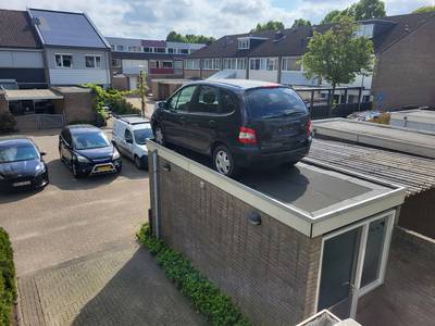 donderdag 25 mei 2023, 12:57 uurHet lijkt wellicht een onhandige oplossing voor het parkeerprobleem: een auto parkeren op het dak van het schuurtje in de voortuin. Maar een bewoner van een wijk in Oss had andere redenen om de auto op het dak te laten takelen.