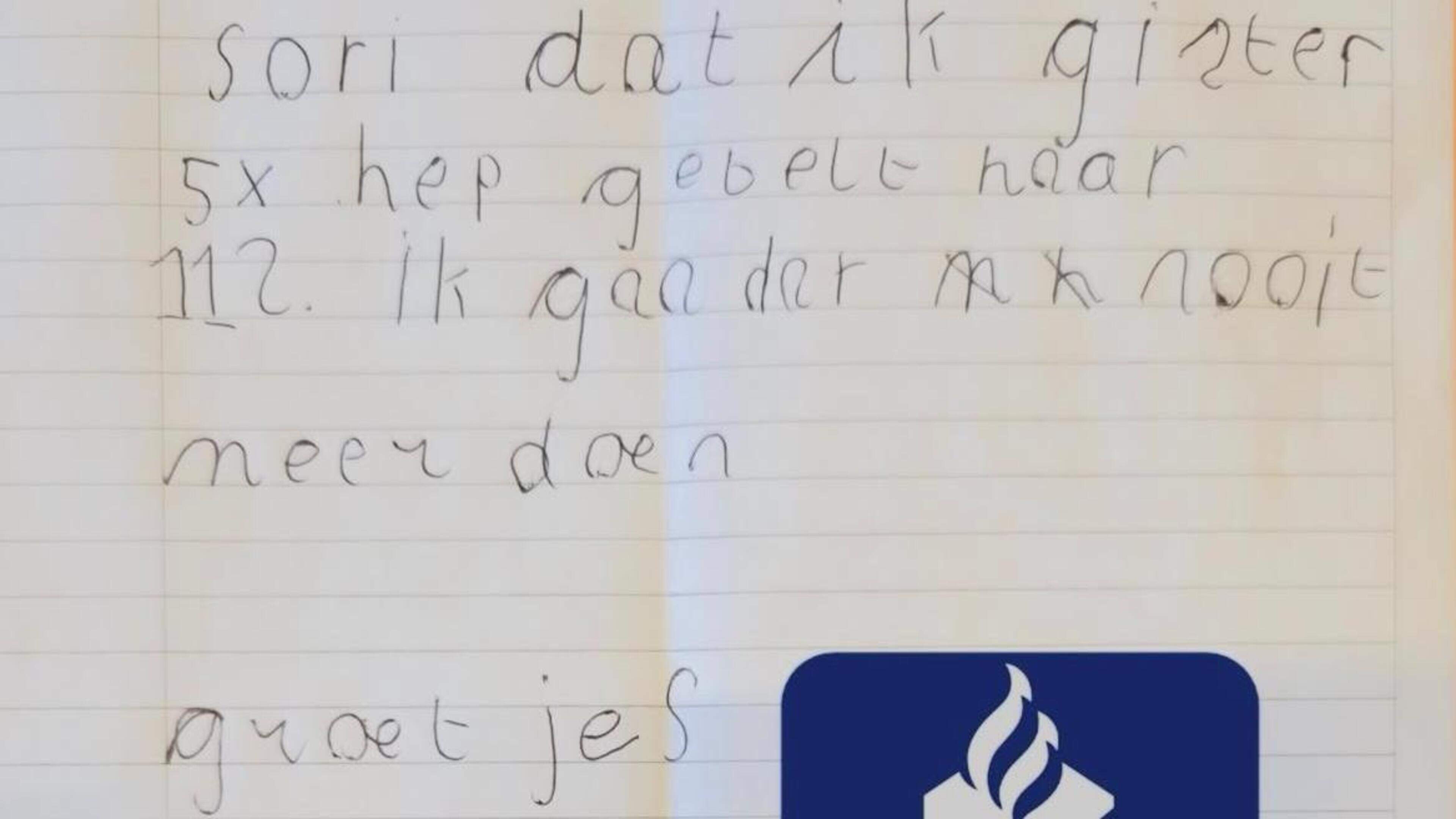 woensdag 8 april 2026, 09:38 uurEen jongetje uit Ridderkerk dat vijf keer onnodig 112 heeft gebeld, is door zijn moeder naar het politiebureau in die plaats gebracht met een wel heel schattig excuusbriefje: „Sori dat ik gister 5 x hep gebelt naar 112. Ik gaa dat nooit meer doen. Groetjes”