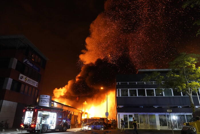 De brandweer is de hele nacht bezig geweest om de brand in een aantal bedrijfspanden te bestrijden. Een naastgelegen hotel werd ontruimd.