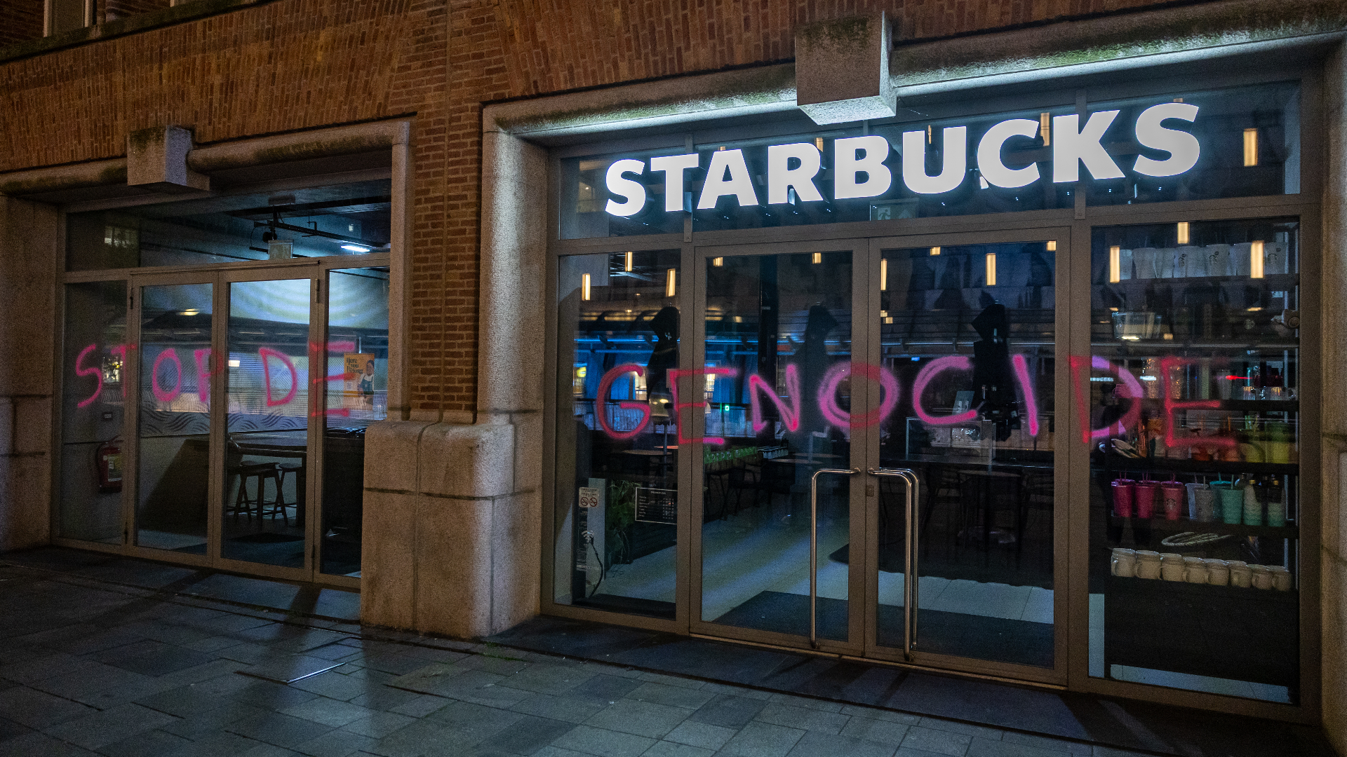 dinsdag 3 juni 2025, 06:07 uurAan de Van Oldenbarneveltplaats in het centrum van Rotterdam is een filiaal van koffiezaak Starbucks beklad. Op de ruiten is 'stop de genocide' gespoten met roze graffiti. Dat gebeurde vermoedelijk maandagavond rond 22:00 uur.