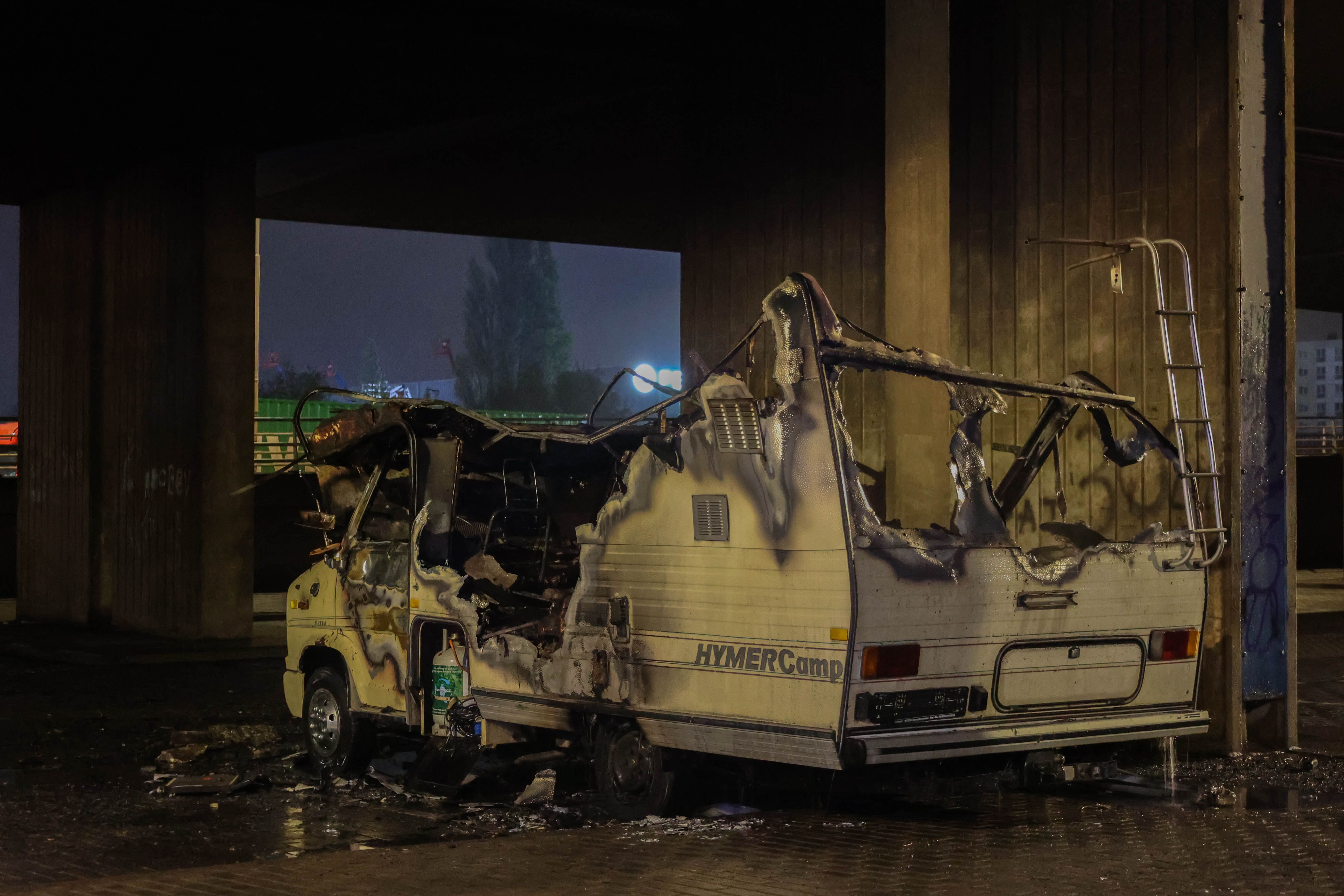 Weinig over van camper na brand onder viaduct in Spaanse Polder