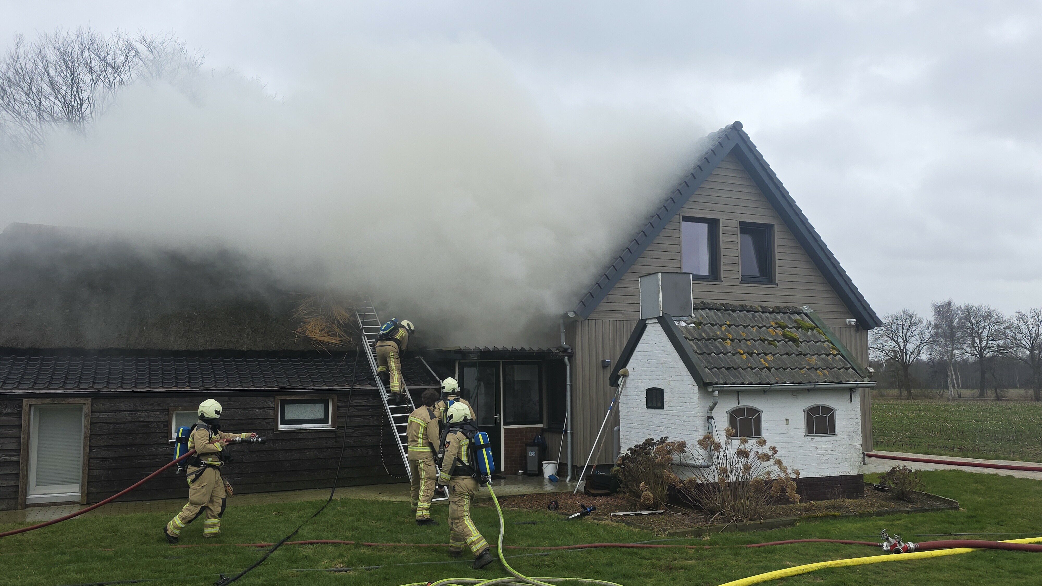 maandag 23 februari 2026, 13:13 uurIn Ruinerwold is brand uitgebroken in het rieten dak van een woning aan de Dijkmansweg.