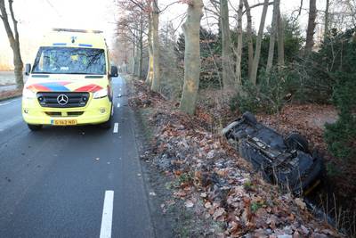 Auto botst tegen boom en eindigt ondersteboven in droge sloot in Schijndel