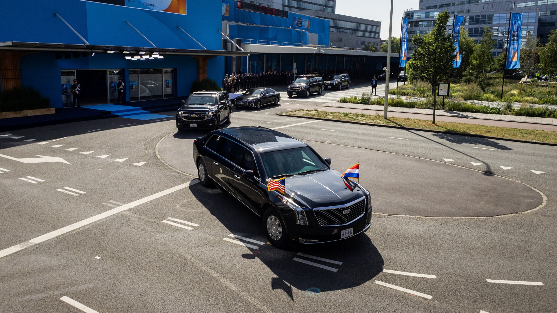 De Amerikaanse president Donald Trump is geland in Nederland voor de Navo-top. Hij is in een imposante stoet voertuigen, waaronder zijn gepantserde Cadillac The Beast, onderweg naar het paleis. Terwijl de meeste regeringsleiders al binnen zijn, wordt er gewacht op Trump voor het diner begint.