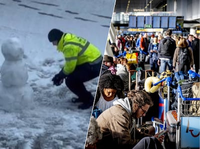 Het is al dagen kommer en kwel in de vertrekhallen, waar duizenden reizigers noodgedwongen bivakkeren op hun koffers. Maar buiten op het platform? Daar is het dolle pret. Een video van een medewerker die een sneeuwpop in elkaar knutselt naast een vliegtuig, gaat de wereld over.