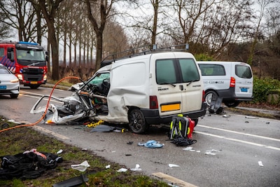 Enorme schade na frontale botsing tussen bedrijfswagen en taxibus in Steenbergen, bestuurder bekneld