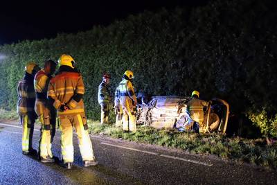 Automobilist verliest macht over het stuur: voertuig eindigt op zijkant tegen een heg
